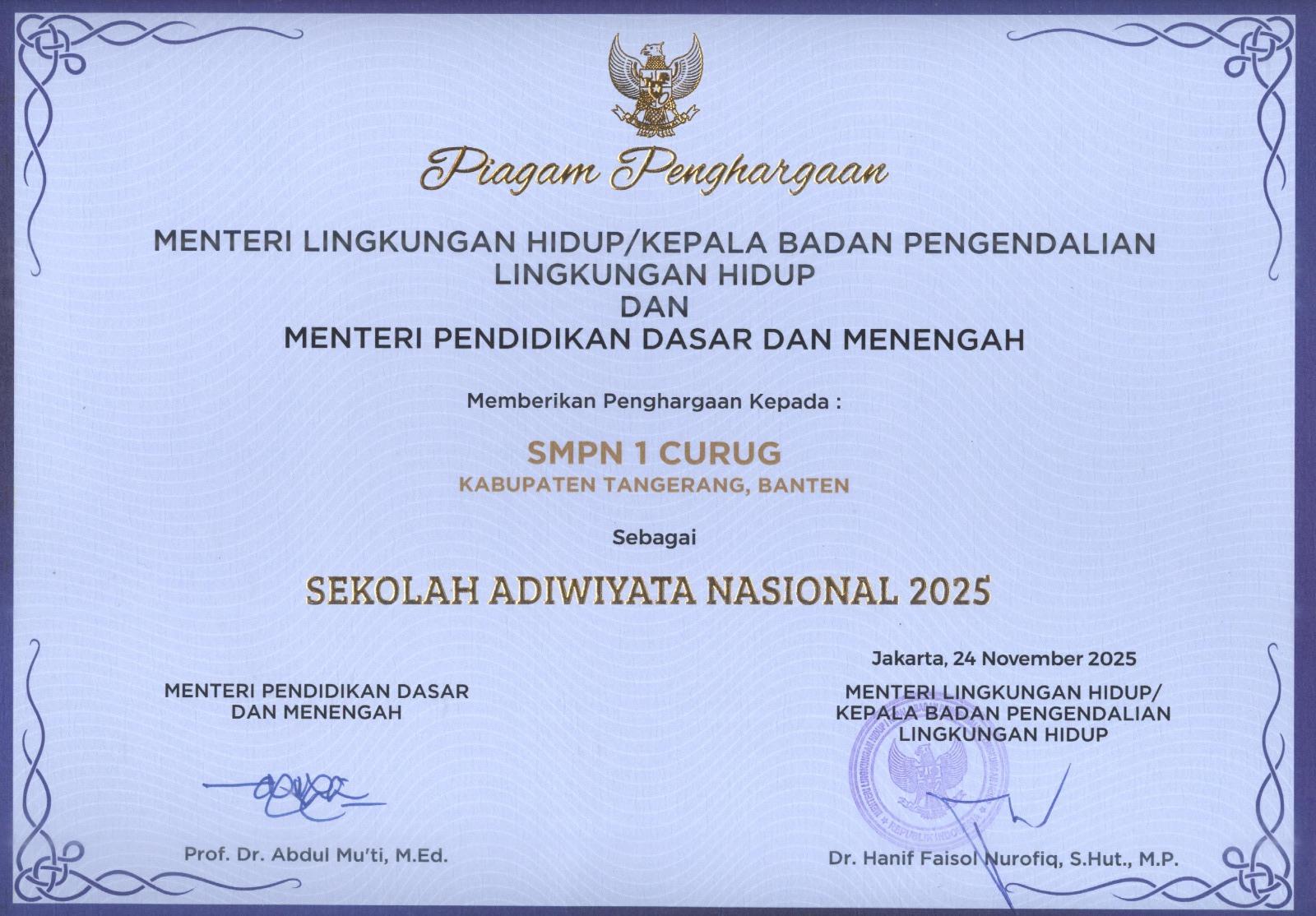 Program Adiwiyata tahun ini mencatatkan sejarah dengan peningkatan partisipasi sekolah sebesar 35,8% dibandingkan tahun sebelumnya. Dari total 979 sekolah penerima, SMP Negeri 1 Curug menjadi bagian dari 721 sekolah yang meraih predikat Adiwiyata Nasional.
